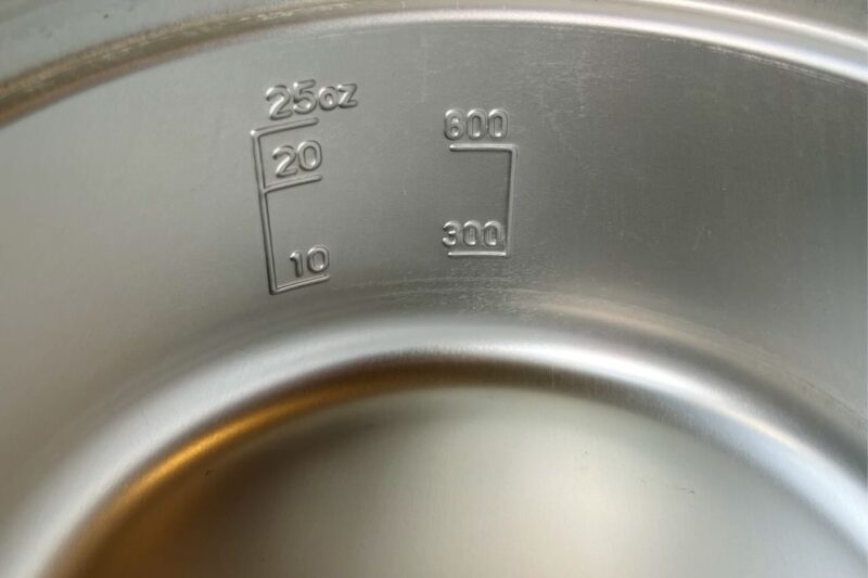 深型クッカーの内側には、300ml、600ml、10oz、20oz、25ozの目盛りがついています。