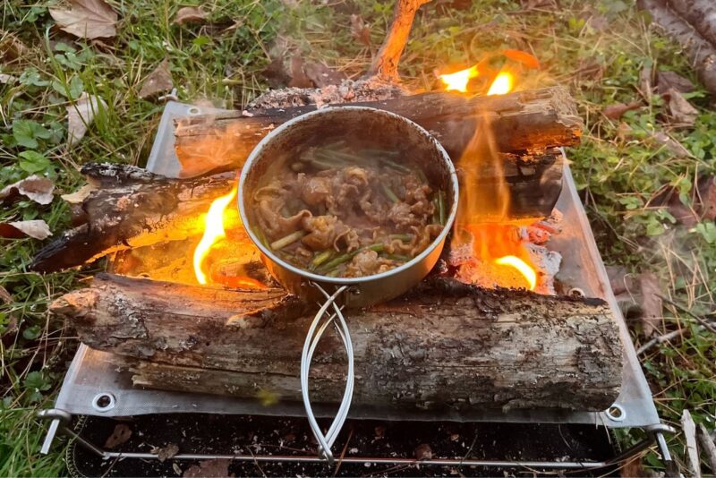 底面の広いクッカーを使用し、薪の配置を工夫すれば五徳がなくても快適に調理が可能な点もうれしいですね。