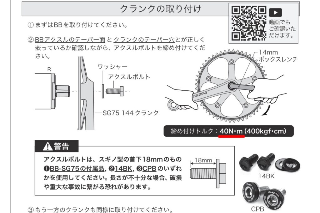 緩むとクランク側の穴が削れて使い物にならなくなるため、指定トルクで確実に締め込みます。