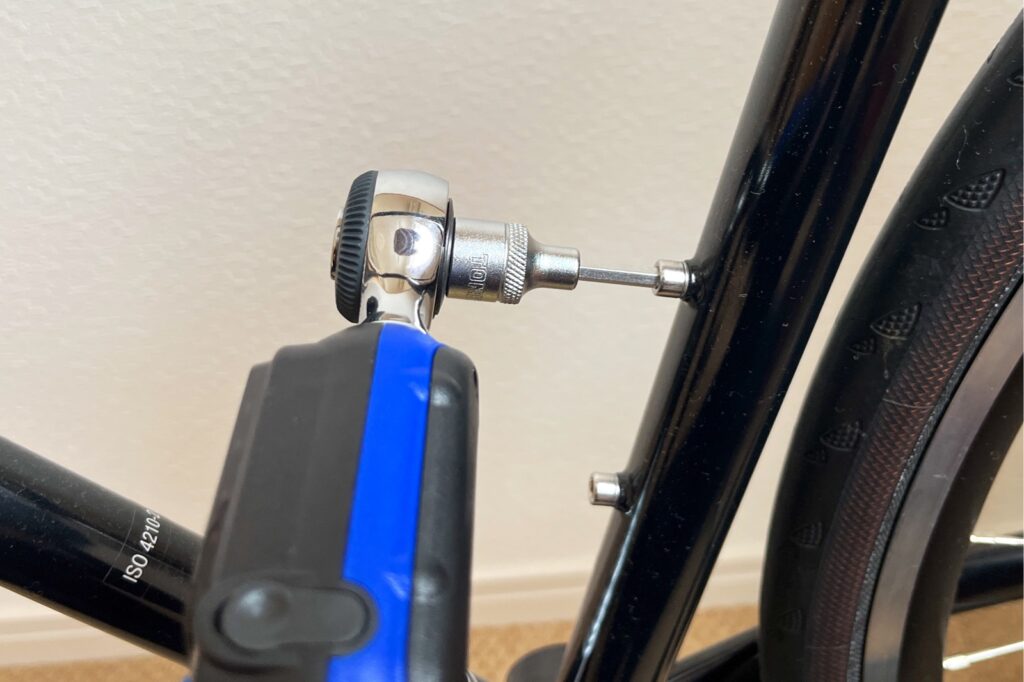 走行中にサドルが動かないよう、2本のボルトを均等に締めて固定します。